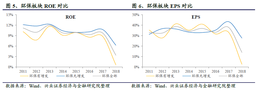 2)EPS:環保板塊有增發板塊EPS在15年達到高點0.41元/股后,持續下滑,且18年大幅下挫至0.03元/股;無增發板塊EPS保持相對穩健增長。我們認為主要是由于資產負債表擴張受阻,相關資金需求型企業業績不及預期所致。濟南純水設備
