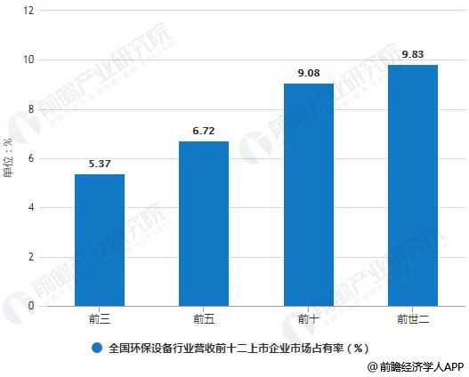 2017年全國環(huán)保設(shè)備行業(yè)營收前十二上市企業(yè)市場(chǎng)占有率統(tǒng)計(jì)情況