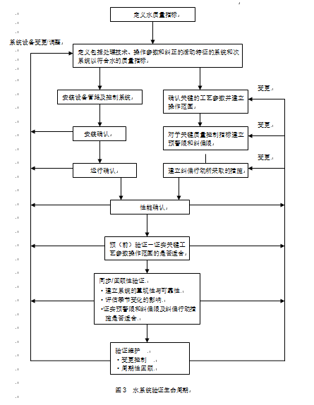 驗證是一個程序,通過此程序獲得和記錄一個高度保證的證明,證明一個特定的工藝將連續生產出符合已建立的一系列質量指標的產品。在驗證非常早的階段之前和驗證期間,制定關鍵的工藝參數和它們的操作范圍。驗證程序確認和證明設備的設計、安裝、運行以及性能。在系統被定義時開始,并且通過幾個階段來進行:安裝確認、運行確認以及性能確認。一個典型水系統驗證生產周期的圖示描述如圖3所示。